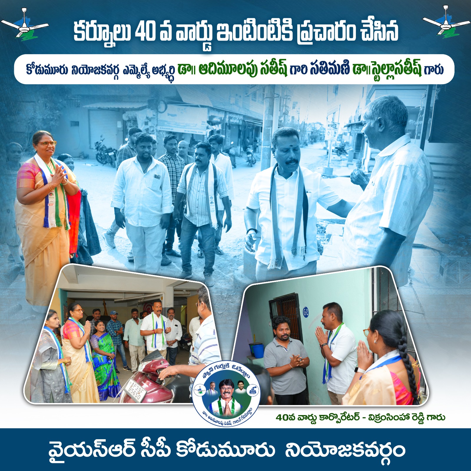 కర్నూలు 40వ వార్డు కార్పొరేటర్ విక్రమ్ సింహారెడ్డి గారి ఆధ్వర్యంలో ఇంటింటికి ప్రచారం నిర్వహించిన కోడుమూరు నియోజకవర్గం ఎమ్మెల్యే అభ్యర్థి డాక్టర్ ఆదిమూలపు సతీష్ గారి సతీమణి శ్రీమతి డాక్టర్. స్టెల్లా సతీష్ గారు..