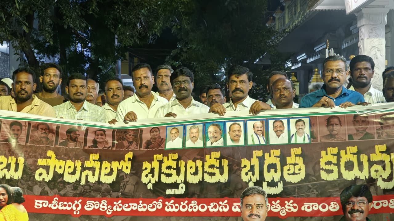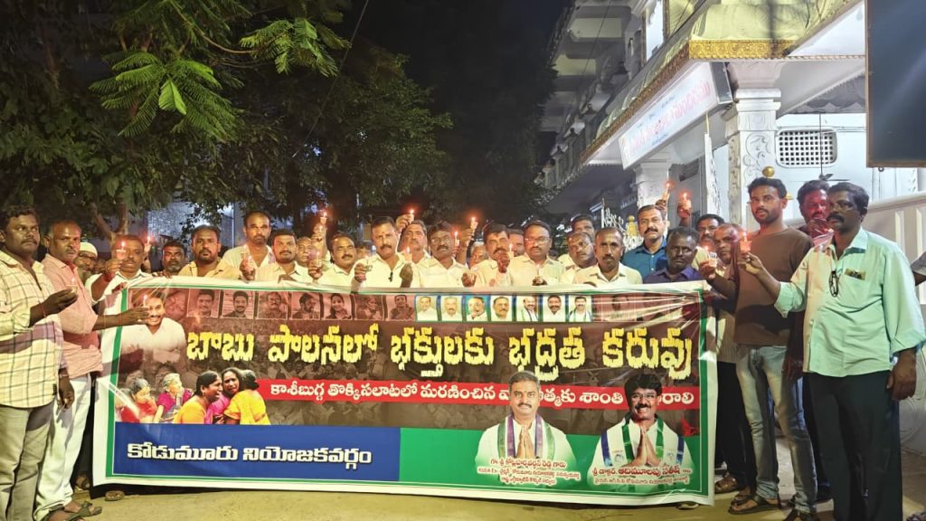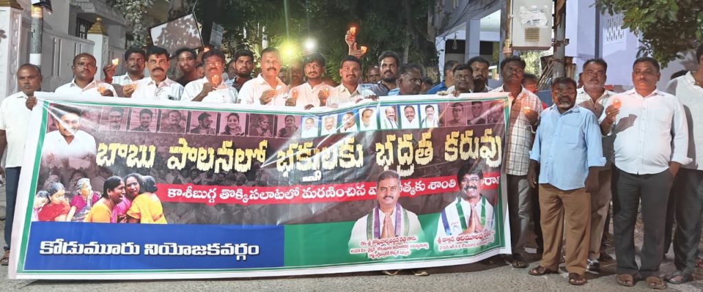 శ్రీకాకుళం జిల్లా కాశీబుగ్గ వేంకటేశ్వర స్వామి ఆలయంలో జరిగిన తొక్కిసలాట ఘటన పూర్తిగా నిఘా వైఫల్యమేనని.. దీనికి ప్రభు త్వ హత్యలుగానే భావిస్తున్నామంటూ వైఎస్ఆర్సీపీ కోడుమూరు నియోజకవర్గ ఇన్చార్జ్ డాక్టర్ ఆదిమూలపు సతీష్ ఆగ్రహం వ్యక్తం చేశారు. మృతుల కుటుంబాలకు ప్రభుత్వం తరఫున రూ.25 లక్షల పరిహారం, ఒక్కో ప్రభుత్వం ఉద్యోగం ఇవ్వాలడి డిమాండ్ చేశారు. కాశీబుగ్గ తొక్కిసలాటలో మృతి చెందిన వారి ఆత్మకు శాంతి చేకూరాలని, సోమవారం రాత్రి వైఎస్సార్సీపీ ఆధ్వర్యంలో కొవ్వొత్తుల ర్యాలీ నిర్వహించారు.