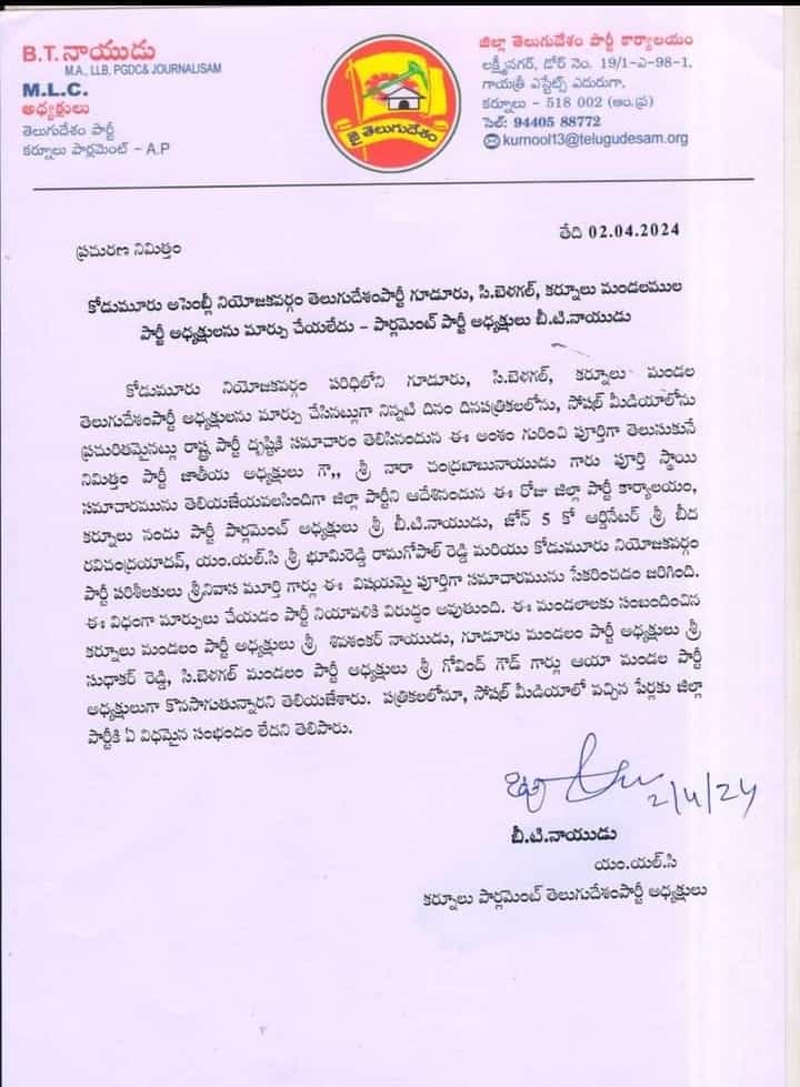 టిడిపి పార్టీ కోడుమూరు నియోజకవర్గం లోని మండల అధ్యక్షులను వారి పదవులను ఎలాంటి మార్పులు చేయలేదని టిడిపి పార్టీ కర్నూలు పార్లమెంట్ అధ్యక్షులు బిటి నాయుడు ప్రకటనను విడుదల చేశారు..