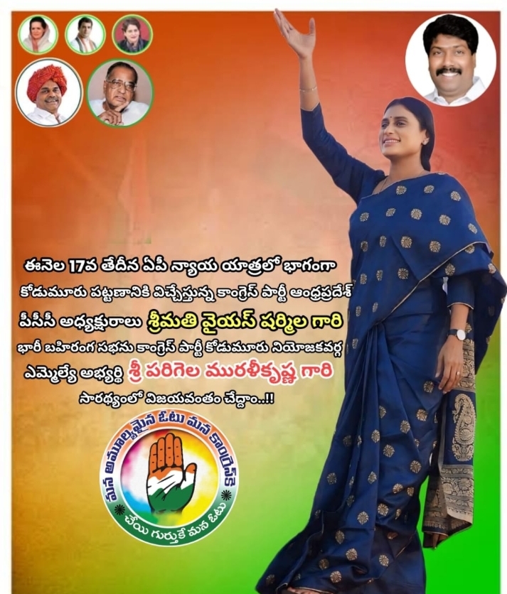 ఈ నెల 17వ తేదీన ఏపీ న్యాయ యాత్రలో భాగంగా కర్నూలు కోడుమూరు పట్టణానికి విచ్చేస్తున్న కాంగ్రెస్ పార్టీ ఆంధ్రప్రదేశ్ రాష్ట్ర పీసీసీ అధ్యక్షురాలు *శ్రీమతి వై యస్ షర్మిల గారి* భారీ బహిరంగ సభను కాంగ్రెస్ పార్టీ కోడుమూరు నియోజకవర్గ ఎమ్మెల్యే అభ్యర్థి,మాజీ ఎమ్మెల్యే,మాజీ టీటీడీ పాలకమండలి సభ్యులు *శ్రీ పరిగెల మురళీకృష్ణ అన్నగారి సారథ్యంలో విజయవంతం చేద్దాం..