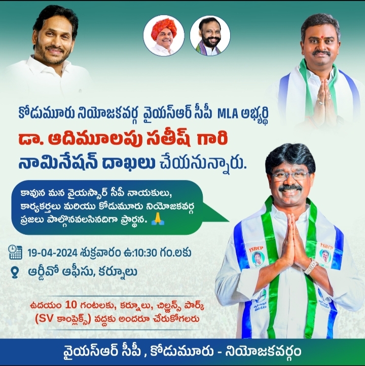 ప్రజలందరి ఆశీస్సులతో వైయస్ఆర్ సీపీ కోడుమూరు నియోజకవర్గ ఎమ్మెల్యే అభ్యర్థి – *డాక్టర్ ఆదిమూలపు సతీష్* గారు నామినేషన్ దాఖలు చేయనున్నారు. కావున కోడుమూరు నియోజకవర్గ ప్రజలు, నియోజకవర్గ వైఎస్ఆర్ కాంగ్రెస్ పార్టీ నాయకులు, కార్యకర్తలు, అభిమానులు పాల్గొని ఈ కార్యక్రమాన్ని విజయవంతం చెయ్యగలరని ఎమ్మెల్యే అభ్యర్థి డాక్టర్ ఆదిమూలపు సతీష్ పిలుపునిచ్చారు